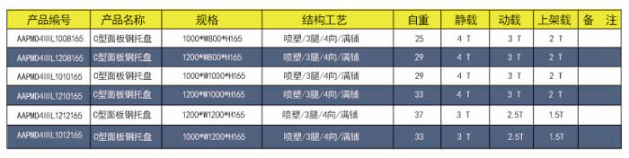 四向三腿——C型面板鋼托盤 技術(shù)參數(shù)說(shuō)明: 產(chǎn)品編號(hào): AAPMD4ⅢL1210165 產(chǎn)品規(guī)格: 1200*1000*165 產(chǎn)品自重: 33kg 防銹工藝: 靜電沙紋噴塑 產(chǎn)品靜載: 3000KG(均勻載重) 產(chǎn)品動(dòng)載: 2500KG(均勻載重) 產(chǎn)品上架: 1500KG(均勻載重) 主要用途: 倉(cāng)庫(kù)、車間周轉(zhuǎn)、物流倉(cāng)儲(chǔ)