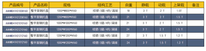 四向三腿——整平面鋼托盤 技術參數(shù)說明: 產(chǎn)品編號: AAHMD4ⅢH1210160 產(chǎn)品名稱: 整平板川字鋼托盤 產(chǎn)品規(guī)格: 1200*1000*160 產(chǎn)品重量: 24kg 產(chǎn)品靜載: 4000KG(均勻載重) 產(chǎn)品動載: 2000KG(均勻載重) 產(chǎn)品上架: 1500KG(均勻載重) 防銹工藝: 靜電沙紋噴塑 主要用途: 倉庫、車間周轉、物流倉儲
