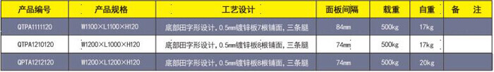 產(chǎn)品編號:QTPA1111120 產(chǎn)品規(guī)格:W1100×L1100×H120 托盤主孔:100mm 托盤側(cè)孔:80 mm 產(chǎn)品自重:16 kg 產(chǎn)品靜載:800kg 產(chǎn)品動載:600kg 上貨架載:不建議 產(chǎn)品配置:采用寶鋼鍍鋅板軋機(jī)成0.5*10*85 多筋骨面板10根,以間隔84mm 和6根板做腿+9個立撐組成。 產(chǎn)品用途:廣泛用于酒水、食品、化工、電子 等大量物品倉儲與周轉(zhuǎn)。 產(chǎn)品缺陷:不宜上貨架。